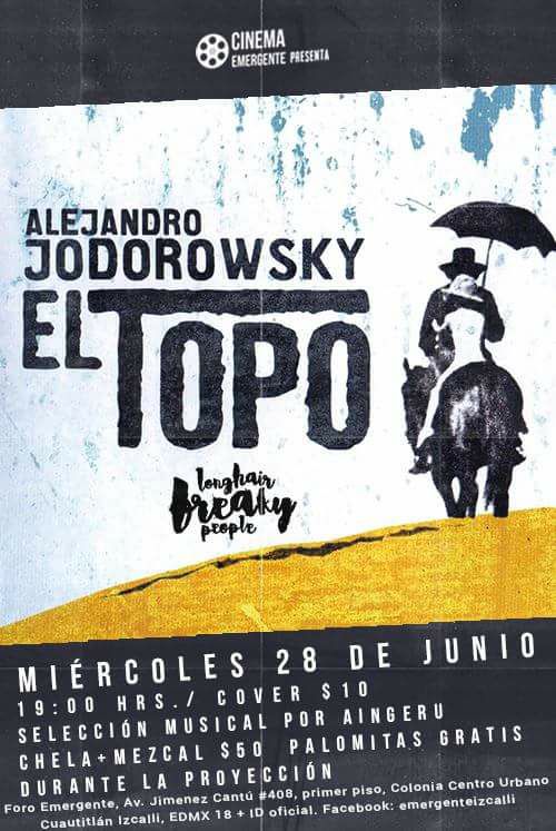 Otro ciclo que ha atravesado las semanas en el Emergente fue el de Western, que proyectó la tremenda True Grit (2010), escrita y dirigida por los hermanos Cohen, y con las actuaciones de Jeff Bridges, Matt Damon y Josh Brolin; A Fistful of Dollars (1964), el clásico de Sergio Leone, con música de Ennio Morricone, y que fundó el subgénero spaghetti western; Django Unchained (2012) penúltimo filme del director estadunidense Quentitn Tarantino, y que contó con las actuaciones de Leonoardo Dicaprio y Jamie Foxx; por último El Topo (1970) de Alejandro Jodorowsky, considerada una de sus mejores, que fundó y nombró el acid western.